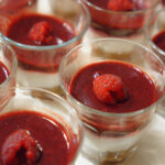 Cheesecake met laagjes van koek, romige vulling en bosvruchten.
