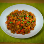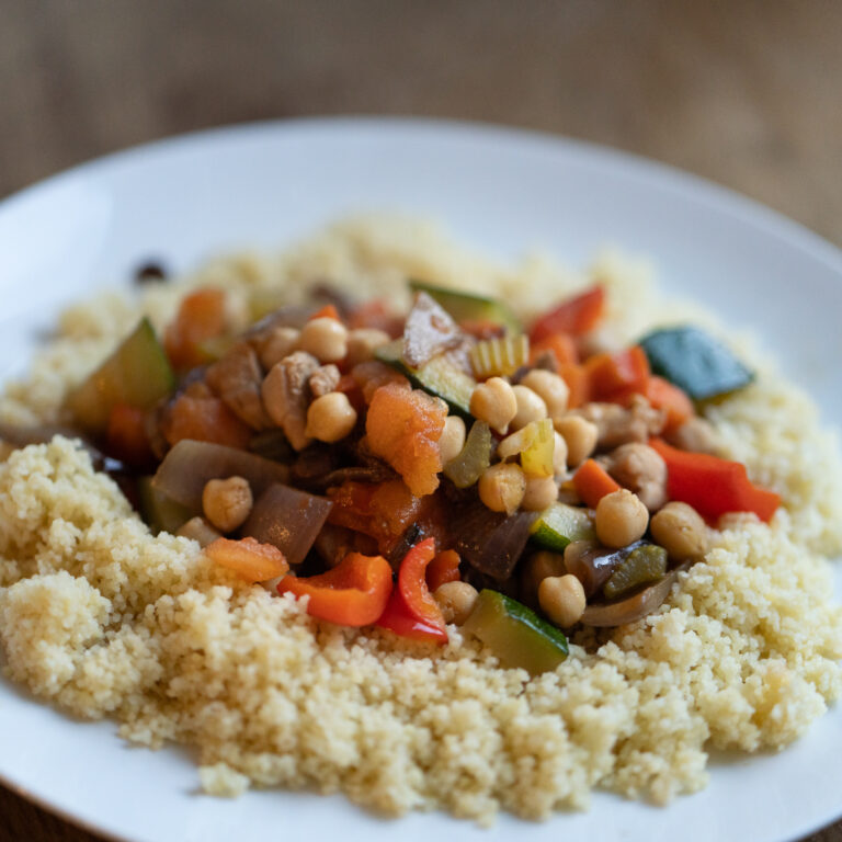 Een heerlijk vegetarische stoofpot met verschillende groenten en rozijnen.