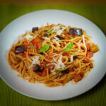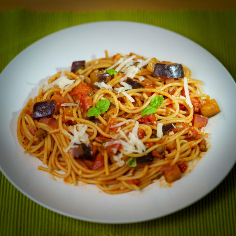 Heerlijk, vegetarisch pastagerecht uit Sicilië met aubergine, tomatensaus en basilicum.