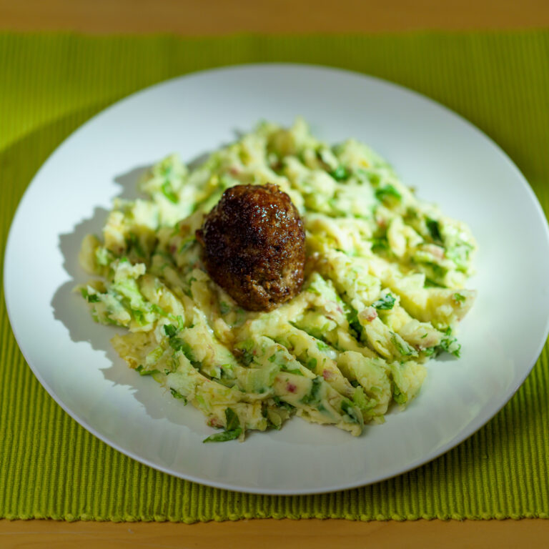 Een lekkere Hollandse stamppot met uitgebakken spekjes en jus.