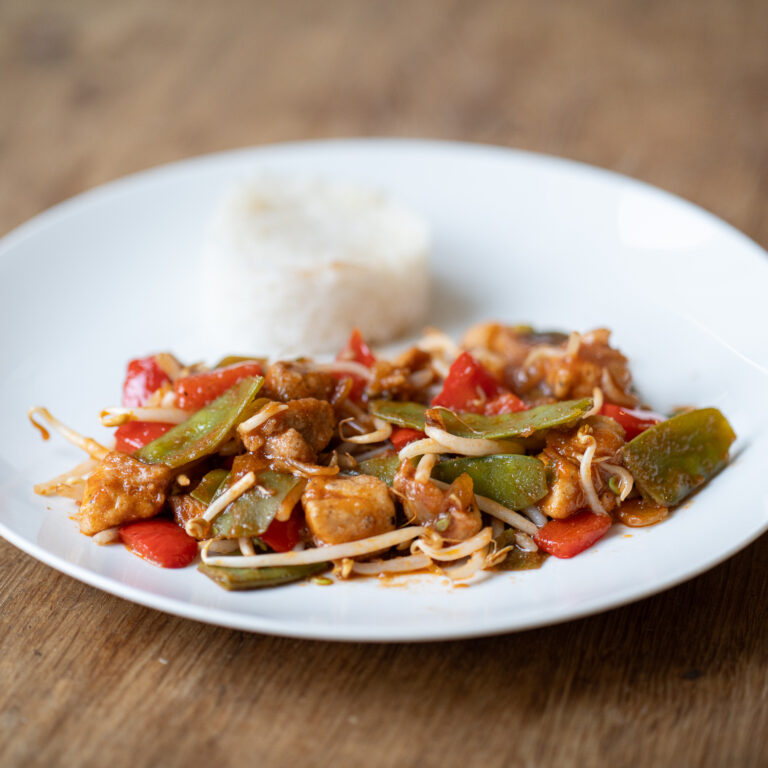 Oosterse roerbak van kip met groenten in een heerlijke zoetzure saus. Geserveerd met rijst.