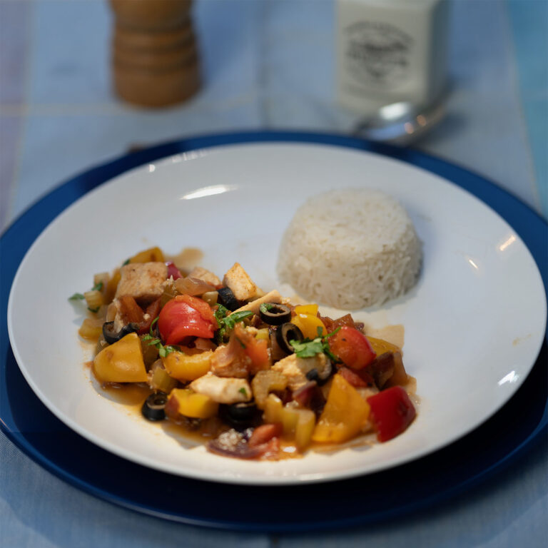 Smakelijk stoofpotje van vis met venkel, olijfjes en witte wijn.